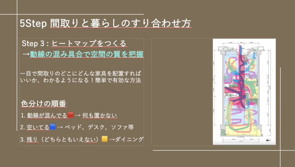 家具配置で整える前に、理想の暮らしと現状のすり合わせを図面上で視覚化する方法をお話しました。これは、私がオリジナルで考えたのもで「一目で空間の質が分かる」ので、理想との差を埋める必要性が誰にでも理解できるやり方になります。