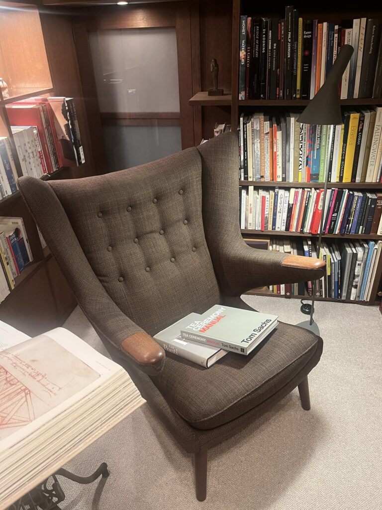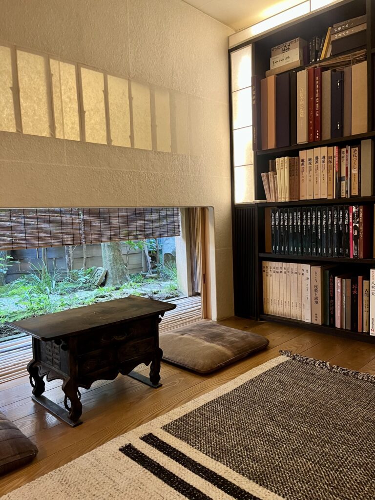 座布団一枚、廊下のアルコーブにある革張り椅子、中庭に面した籐座面の椅子。